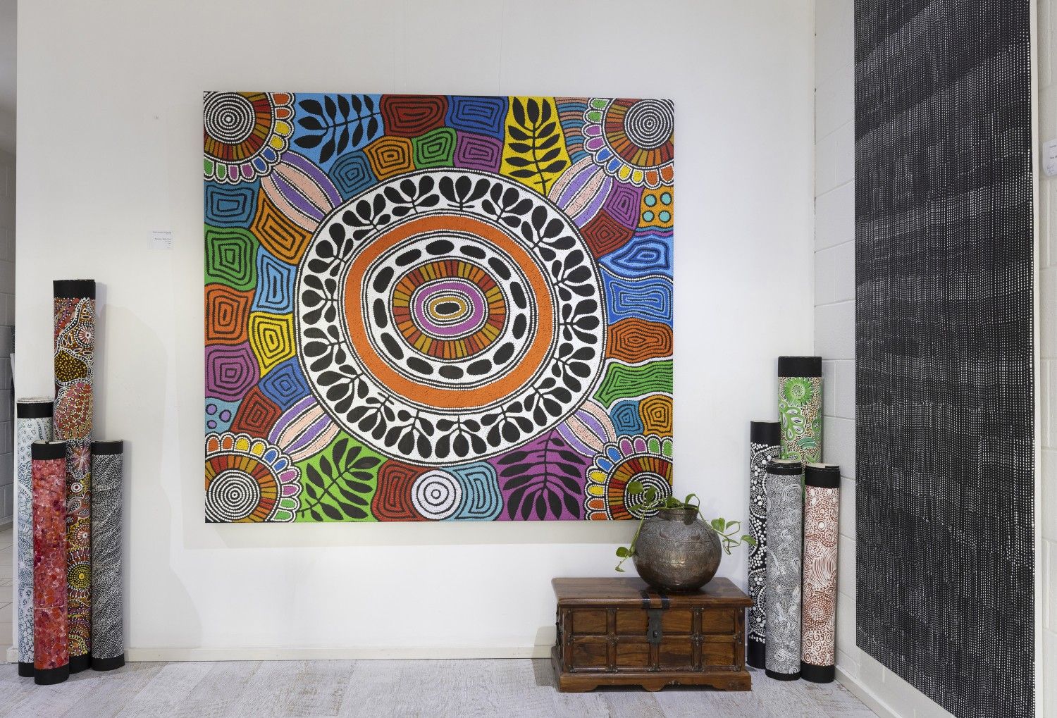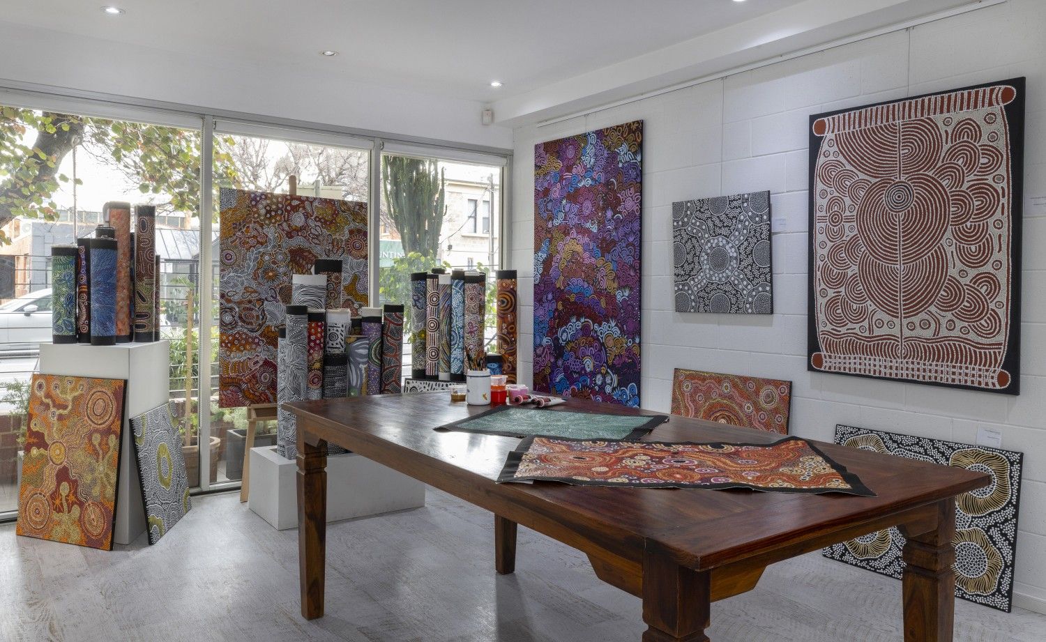 Small gallery in Adelaide specialising in showcasing and sales of original paintings and craft (no prints, no homewares) by artists originating from the Central and Western Desert regions. Artists regularly paint in the studio. Buy stretched and ready to hang or rolled canvas in a tube for transport.