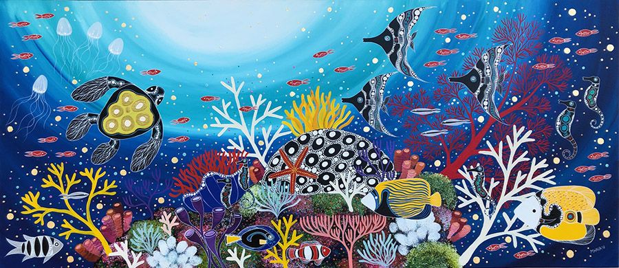 She’s one of the most recognisable and diversified artists from Tropical North Queensland. Based in Gimuy/Cairns, Melanie remains close to her rainforest and reef homelands. She also has Austrian heritage and has created a unique style for her art—glittering depictions of rainforest and reef scenes—with European influences in her storytelling.