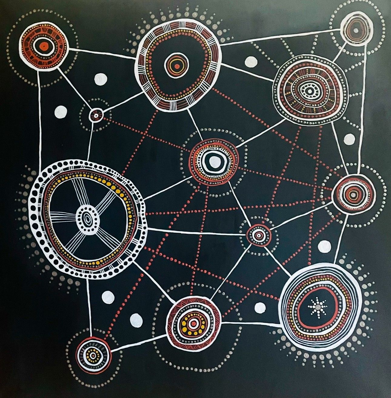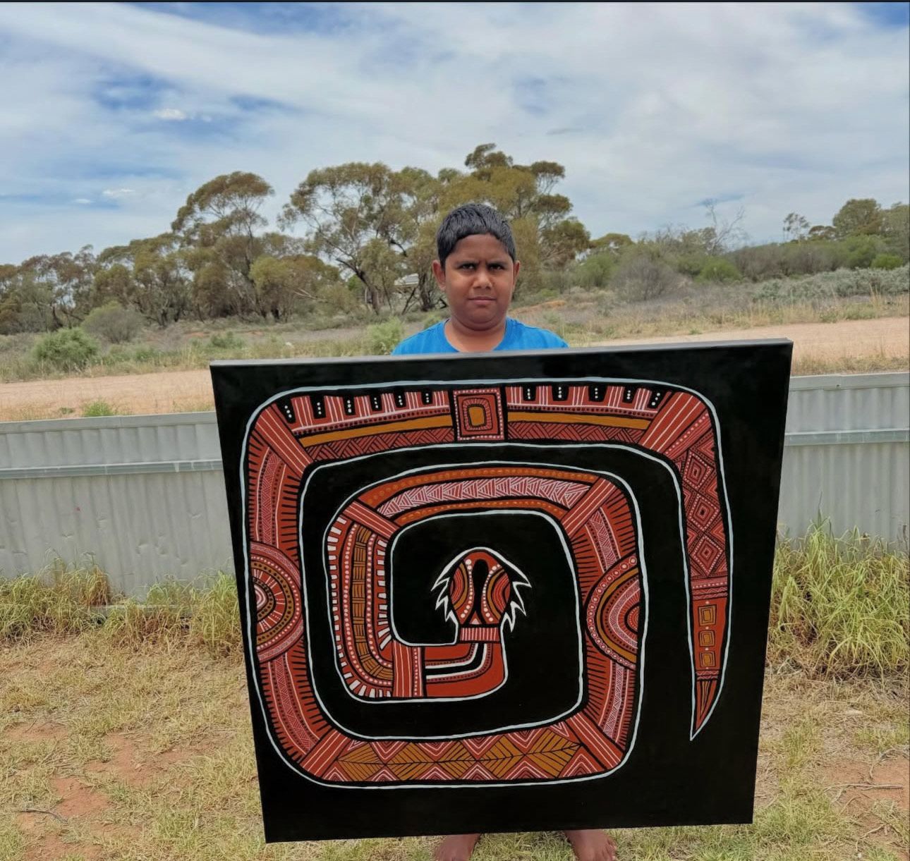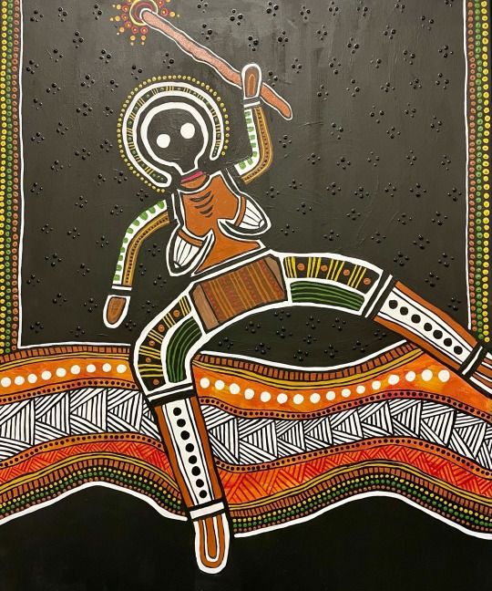 Sian Harris is a Kurnu Paakantyi woman from Wilcannia in far west New South Wales. She is a contemporary Aboriginal artist who works mainly with acrylic on canvas and mixed media works on paper. Her body of work comes from the worldview of a Kurnu Paakantyi Nhuungku. The pieces are at once personal and political, in keeping with the artist’s stance that her presence, as a self-presenting Blak Woman, in systems and structures built to exclude her, is a radical act. The work focuses on Paakantyi Spirituality; Aboriginal resistance; connection to Country; decolonising queerness; mental illness; and representations of womanhood and the female form.